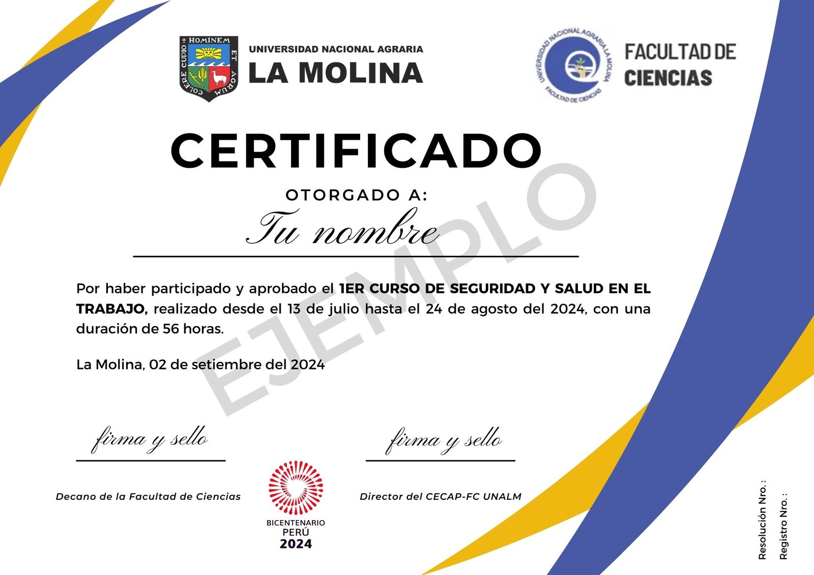Al haber aprobado el CURSO DE SEGURIDAD Y SALUD EN EL TRABAJO con un promedio ponderado no menor a 14 se le otorga al participante un Certificado a nombre de la Universidad Nacional Agraria La Molina, de la Facultad de Ciencias, con 56 horas certificadas.