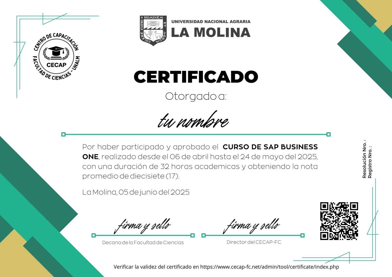 El participante que apruebe el curso con un promedio ponderado mínimo de 14 obtendrá un Certificado oficial emitido a nombre de la Universidad Nacional Agraria La Molina – Facultad de Ciencias, que acredita satisfactoriamente la culminación y aprobación del curso.